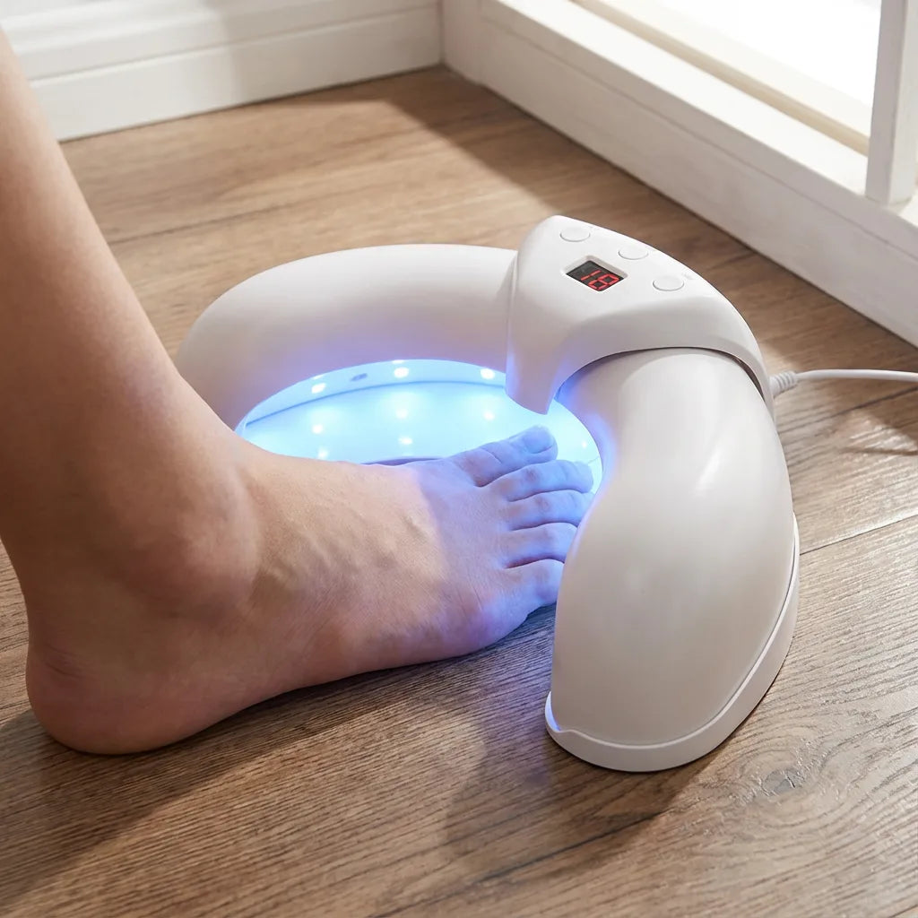 Instead of adding another layer, the device delivers light as part of a simple, at-home system designed for nail appearance concerns. That’s the core difference -